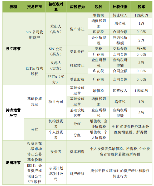 REITs的運作主要包括三個環(huán)節(jié):即設(shè)立(資產(chǎn)重組、股權(quán)轉(zhuǎn)讓)環(huán)節(jié)、持有運營環(huán)節(jié)和退出環(huán)節(jié),涉及的稅種包括:印花稅、企業(yè)所得稅、契稅、增值稅等。其中,基礎(chǔ)設(shè)施REITs面臨的稅收問題主要是資產(chǎn)重組環(huán)節(jié)涉及的土地增值稅和股權(quán)轉(zhuǎn)讓環(huán)節(jié)涉及的企業(yè)所得稅。設(shè)立REITs通常需對基礎(chǔ)設(shè)施資產(chǎn)進行資產(chǎn)重組,并被視為交易行為,需繳納相關(guān)稅費。如果涉及土地轉(zhuǎn)讓的,原則上則應(yīng)當征收土地增值稅。而在部分國家,對于REITs底層資產(chǎn)的契稅、印花稅等稅種有減免,在我國針對REITs底層資產(chǎn)的稅收減免缺失。