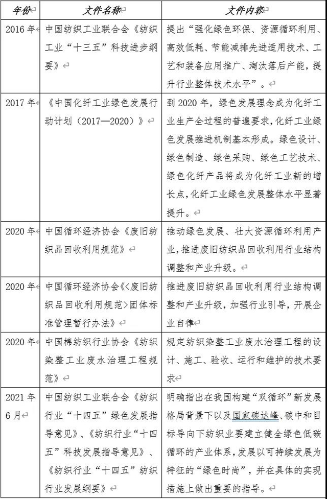 標(biāo)準(zhǔn)指導(dǎo)層面,《綠色產(chǎn)業(yè)指導(dǎo)目錄(2019年版)》將廢舊紡織品無害化再生利用裝備、紡織印染等高用水行業(yè)廢水處理回用裝置以及廢舊紡織品等廢舊資源的再生利用列入節(jié)能環(huán)保產(chǎn)業(yè),將紡織行業(yè)的園區(qū)產(chǎn)業(yè)鏈接循環(huán)化改造列入清潔生產(chǎn)產(chǎn)業(yè)。將紡織面料等產(chǎn)品的低碳產(chǎn)品認(rèn)證和推廣列入綠色服務(wù)。