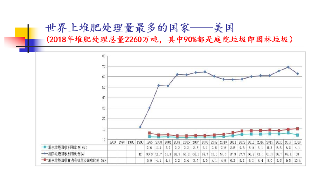 實(shí)際上,在全世界范圍內(nèi)比較,生活源、家庭源廚余垃圾及庭院垃圾(園林垃圾)堆肥利用量最大的國(guó)家是美國(guó)。美國(guó)在2018年垃圾堆肥處理總量達(dá)到2260萬噸,其中90%都是園林垃圾。