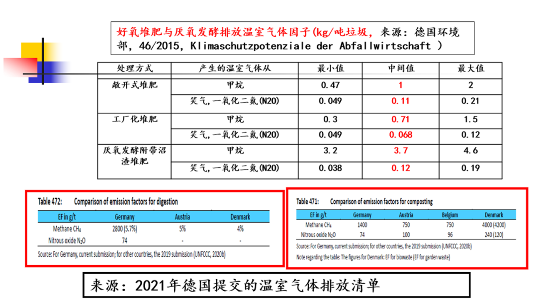 從歐盟提交給聯(lián)合國(guó)的數(shù)據(jù)來看,厭氧消化實(shí)際是增加溫室氣體的排放。歐洲的專家既然了解這個(gè)現(xiàn)實(shí),為何還要到包括中國(guó)在內(nèi)的發(fā)展中國(guó)家來建議要做有機(jī)垃圾的厭氧或堆肥呢?其實(shí)背后也有更深層次的原因,一方面發(fā)展中國(guó)家財(cái)政實(shí)力相對(duì)較弱,難以普遍負(fù)擔(dān)高成本的垃圾焚燒發(fā)電。而另一方面在降污和減碳的雙重壓力下又切實(shí)需要減少有機(jī)垃圾的直接填埋。在這種復(fù)雜情況下,將有機(jī)垃圾分出一部分做厭氧或堆肥,實(shí)際還是能夠達(dá)到一定減排的效果。下圖中展示的是德國(guó)提交的溫室氣體排放清單中厭氧或堆肥工藝過程中,一噸有機(jī)垃圾處理排放的二氧化碳當(dāng)量。