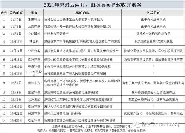 但更多的是,不少我們熟知的上市環(huán)企為了降低負(fù)債、保存實(shí)力“過冬”、緩解資金流動(dòng)壓力,開始“賣賣賣”,小至某個(gè)污水處理廠、垃圾焚燒廠股權(quán)出售,大至整個(gè)公司實(shí)控人發(fā)生變更,年末最后兩月累計(jì)發(fā)生的26起并購交易案,其中“賣賣賣”占據(jù)一半,高達(dá)14起。