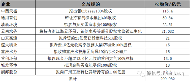 尤其值得一提的是,去年年度TOP 10并購案累計(jì)交易規(guī)模高達(dá)300億元,排名前三的,除了業(yè)內(nèi)熟知買來又賣的中國天楹出售Urbaser之外,還有兩樁鮮為人知的收購大案:通用首創(chuàng)50.84億元轉(zhuǎn)讓40%深水集團(tuán)股權(quán),以及清新環(huán)境作價(jià)22.51億元競(jìng)買國潤水務(wù)。