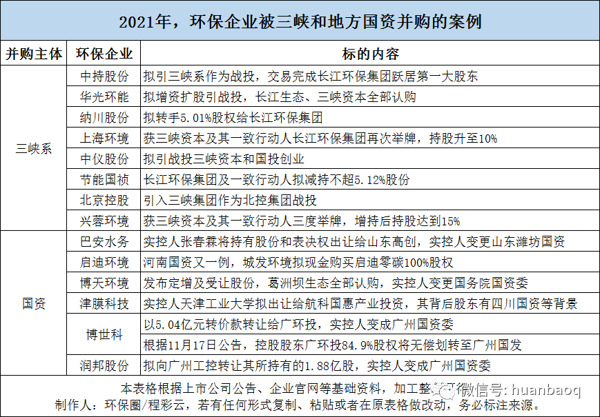深:影響之深為近年來之最,去年發(fā)生的88起收并購,從某種意義上講已經(jīng)不是某些企業(yè)的戰(zhàn)略進與退,也不是傳統(tǒng)行業(yè)跨界環(huán)保這樣簡單,它背后傳遞的信號有央企、國資、民企、外企四股力量的競爭更迭,也有行業(yè)最徹底洗牌、低負債對高負債的清算等,意味深遠。并購頻率之多、交易金額之大,波及范圍之廣,產(chǎn)業(yè)影響之深,讓2021年環(huán)保產(chǎn)業(yè)收并購更加有看頭。在這一年里,我們不僅見證了世界級環(huán)保巨頭“老大并購老二”的一波三折,也領略了三峽、地方國資進擊環(huán)保行業(yè)的“兇猛”,還看到了部分民企賣資產(chǎn),國資接盤“混改”大潮的落幕。從2020年8月,威立雅首次提出要收購蘇伊士股份起,直到2021年12月14日,歐盟委員會正式批準二者收購交易,這場歷時1年零三個月,震驚環(huán)保圈的收購大案也進入收尾階段。最終的收購價,威立雅同意以每股20.50歐元的價格收購蘇伊士股份,要比最初的每股15歐元的報價加價不少。(詳情查閱:威立雅蘇伊士簽署合并協(xié)議,“洋水務”劍指中國市場?)去年6月,中國天楹宣布要15億歐元(折合人民幣約115億元)出售Urbaser 100%股權,9月底就走完了各項流程,10月中下旬就披露完成了所有交割事項,速度非???,絲毫不拖泥帶水。對于這場收購案,媒體評價大都是正面,甚至有的還說中國天楹“里外躺贏”,在持有Urbaser的這些年中,中國天楹不僅在技術提升、產(chǎn)業(yè)鏈布局、海外業(yè)務、品牌影響力等方面獲益匪淺,而且通過買賣騰挪,中間除了掙了3.5億歐元投資差價之外,還把公司資產(chǎn)負債率,商譽減值風險都降低了,簡直是人生贏家。(詳情查閱:中國天楹擬15億歐元出售Urbaser,賠了or賺了?)“一波三折”的城發(fā)環(huán)境換股吸收合并啟迪環(huán)境案,從去年年初一直持續(xù)到8月,才經(jīng)過河南省財政廳及河南省國資委正式批復,中間較為突破的是6月份,城發(fā)環(huán)境宣布擬12.8億元并購啟迪環(huán)境相關資產(chǎn),其中擬定10億元收購鄭州啟迪零碳100%股權,2.81億元收購武漢啟迪生態(tài)所持的5家下屬公司95%股權。帶著政治任務而來的三峽集團,近兩年不斷擴大自己“朋友圈”,一旦被其看上,輕則舉牌增持股份,比如興蓉環(huán)境、上海環(huán)境就多次獲其增持;重則引入戰(zhàn)投,躍居大股東,比如中持,享受項目、訂單上的傾斜。據(jù)筆者不完全統(tǒng)計,2021年,三峽系通過三峽資本以及一致行動人長江生態(tài)環(huán)保集團,引戰(zhàn)投、舉牌增持上市環(huán)企高達8家,其中不僅有北控水務、上海環(huán)境、中持股份、興蓉環(huán)境等水務龍頭,還有華光環(huán)能、納川股份、中儀股份等細分領域的“強兵悍將”。最后的這個,不是某一家環(huán)保企業(yè),而是一類環(huán)保企業(yè)。從2018年起,環(huán)保行業(yè)的“混改潮”已經(jīng)持續(xù)了好幾年。本以為這場上市民企易主、國資混改的悲情大戲就要完結了,誰知去年還是斷斷續(xù)續(xù)有地方國資接盤上市民企案發(fā)生,兜兜轉轉,博世科、巴安水務、博天環(huán)境、潤邦股份、啟迪環(huán)境終于在去年成功聯(lián)姻國資,抱上了金主大腿。▼圖五:三峽系和地方國資增持并購環(huán)保案例