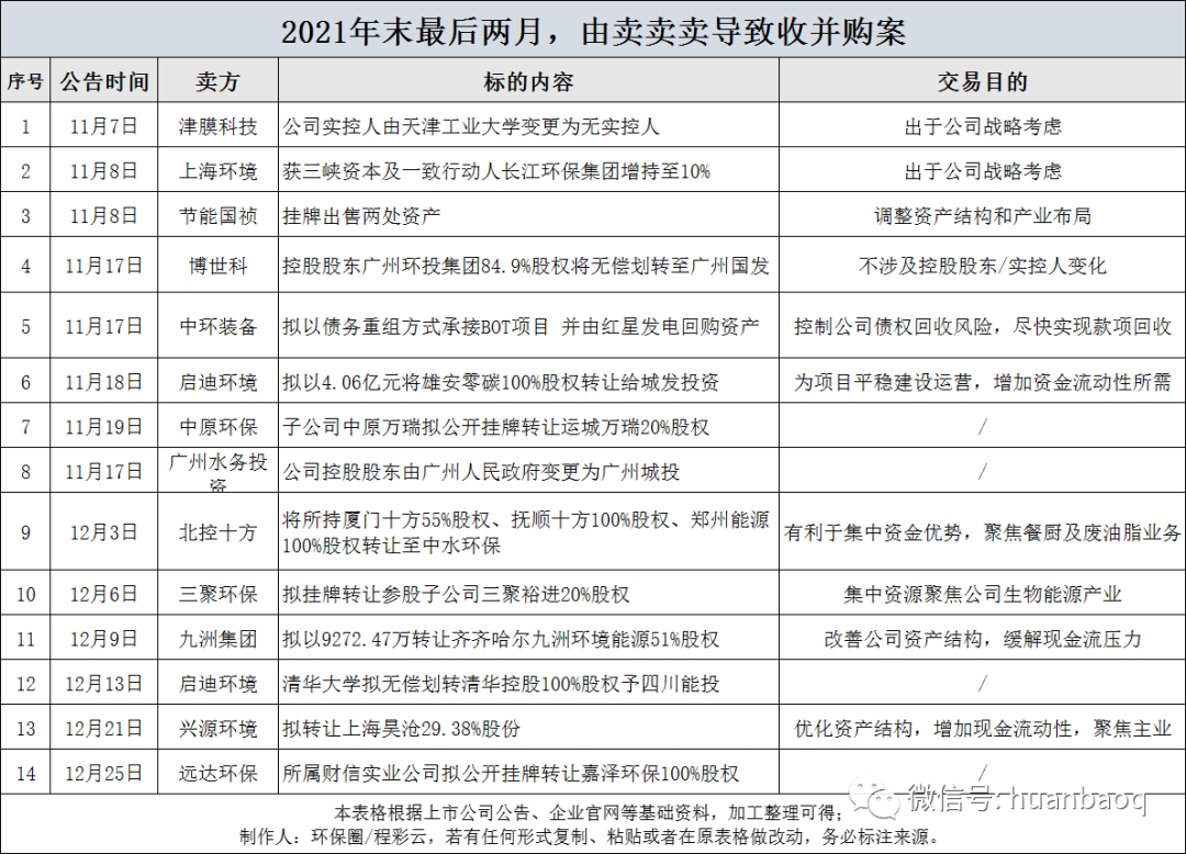 全:類型之全為近年來之最,不同于以往單一跨界并購或者延伸產(chǎn)業(yè)鏈,去年88起并購案交易類型更加全面。既有出于戰(zhàn)略考慮,完善產(chǎn)業(yè)鏈上下游,迅速占領某個地區(qū)市場的;也有極個別傳統(tǒng)產(chǎn)業(yè)跨界轉型而來,搶灘環(huán)保的(環(huán)衛(wèi)賽道尤其突出);還有像光大環(huán)境、城發(fā)環(huán)境、海天水務、高能環(huán)境等優(yōu)質(zhì)企業(yè),為了進一步增厚原有項目規(guī)模,直接收購成熟運營資產(chǎn)的。但更多的是,不少我們熟知的上市環(huán)企為了降低負債、保存實力“過冬”、緩解資金流動壓力,開始“賣賣賣”,小至某個污水處理廠、垃圾焚燒廠股權出售,大至整個公司實控人發(fā)生變更,年末最后兩月累計發(fā)生的26起并購交易案,其中“賣賣賣”占據(jù)一半,高達14起。▼圖四:年末最后兩月26起并購交易案,“賣賣賣”占據(jù)一半