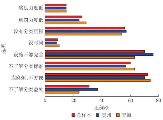 圖 4 實(shí)施垃圾分類的困難分析 完善配套設(shè)施是居民實(shí)施垃圾分類的硬件基礎(chǔ),但其所發(fā)揮的實(shí)際效果很大程度上取決于主觀因素,受政策宣傳的影響較大。調(diào)查對(duì)垃圾分類政策的了解情況,結(jié)果如圖4(b)所示,其選項(xiàng)包括“非常了解”“比較了解”“很少了解”和“完全不了解”,選擇率分別為6%、34%、55%、5%。60%的受訪者對(duì)相關(guān)政策的了解不充分,“非常了解”的受訪者不足一成,政策認(rèn)知水平較低。與青海樣本相比,政策認(rèn)知程度低的問題在貴州樣本中更突出[Sig.(雙側(cè))<0.05]。