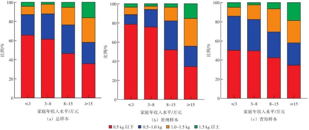 調(diào)查垃圾分類政策的宣傳力度,結(jié)果如圖4(c)所示,其設(shè)置“很多”“較多”“一般”“較少”“從不”5個(gè)選項(xiàng),選擇率分別為4%、9%、27%、38%、22%。多數(shù)受訪者認(rèn)為宣傳力度不足,認(rèn)為宣傳“很多”的比例不足一成,“從不”宣傳的比例高達(dá)22%。與青海相比,貴州宣傳力度不足的問題更顯著[Sig.(雙側(cè))<0.05],極可能是貴州樣本政策認(rèn)知程度較低的原因。