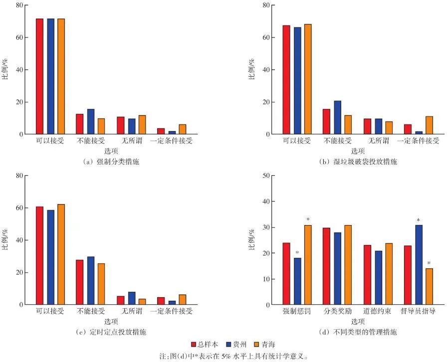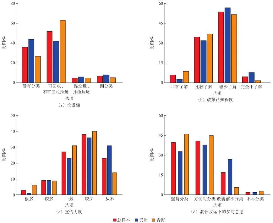 不同地區(qū)在垃圾分類管理模式的選擇上應(yīng)有所側(cè)重。以卡方檢驗(yàn)分析兩地受訪者對(duì)管理模式的選擇差異,見圖5(d),兩地樣本在“分類獎(jiǎng)勵(lì)”和“道德約束”兩項(xiàng)的選擇差異不顯著,而“強(qiáng)制懲罰”和“督導(dǎo)員指導(dǎo)”兩項(xiàng)的選擇存在顯著差異,因此強(qiáng)制型和引導(dǎo)型管理的側(cè)重更值得關(guān)注。青海居民更傾向于選擇“強(qiáng)制懲罰”(P<0.05),可能因?yàn)榍嗪5沫h(huán)境衛(wèi)生壓力和居民參與意愿相對(duì)較高。同時(shí)選擇“懲罰力度較低”的比例相對(duì)較高(圖3),當(dāng)?shù)貞土P力度不足問題可能更突出,建議青海相對(duì)側(cè)重加強(qiáng)強(qiáng)制型管理。貴州居民更傾向于選擇“督導(dǎo)員指導(dǎo)”(P<0.05),貴州居民參與意愿和政策認(rèn)識(shí)水平相對(duì)較低,可能更需要督導(dǎo)員的專門指導(dǎo),建議貴州相對(duì)側(cè)重加強(qiáng)引導(dǎo)型管理。