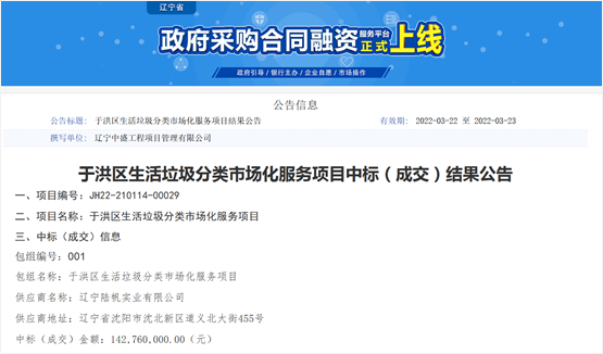 遼寧省政府采購網(wǎng)消息,2022年3月22日,沈陽市于洪區(qū)生活垃圾分類市場化服務(wù)項(xiàng)目公布開標(biāo)結(jié)果,成交價(jià)1.4276億元。