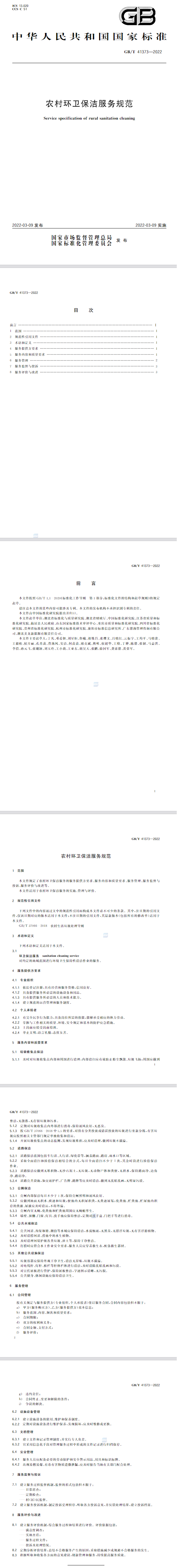 日前,國(guó)家市場(chǎng)監(jiān)督管理總局、中國(guó)國(guó)家標(biāo)準(zhǔn)化管理委員會(huì)聯(lián)合編制的《農(nóng)村環(huán)衛(wèi)保潔服務(wù)規(guī)范》(GB/T 41373-2022)發(fā)布,并于2022年3月9日正式施行。