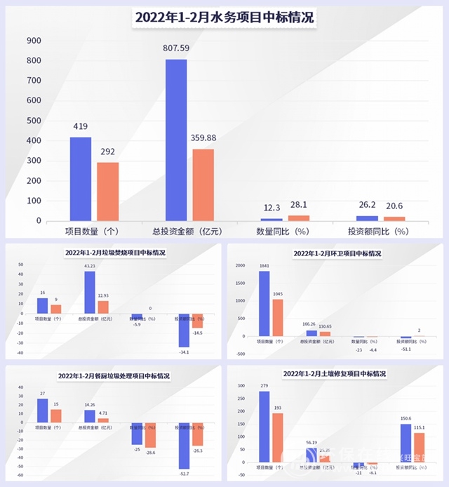 從上述圖表來看,2022年前兩個月,環(huán)衛(wèi)中標(biāo)項目最多,水務(wù)中標(biāo)金額最大,餐廚垃圾的同比下滑最多,土壤修復(fù)2個月的投資額同比增幅均超過了110%,1月更是達(dá)到了150.6%,而同時中標(biāo)數(shù)量卻是下降的,堪稱“完美逆襲”。