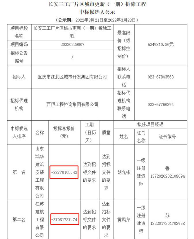 這個奇葩的案例,就是不久前發(fā)布中標公告的重慶市長安三工廠片區(qū)城市更新(一期)拆除工程項目。中標人為山東鴻華建筑安裝工程有限公司(私企),中標金額約為“-3877.01萬元”。更有意思的是,第二中標人和第三中標人的報價分別為-3708.18萬元和-3517.51萬元,也均為負數(shù)。