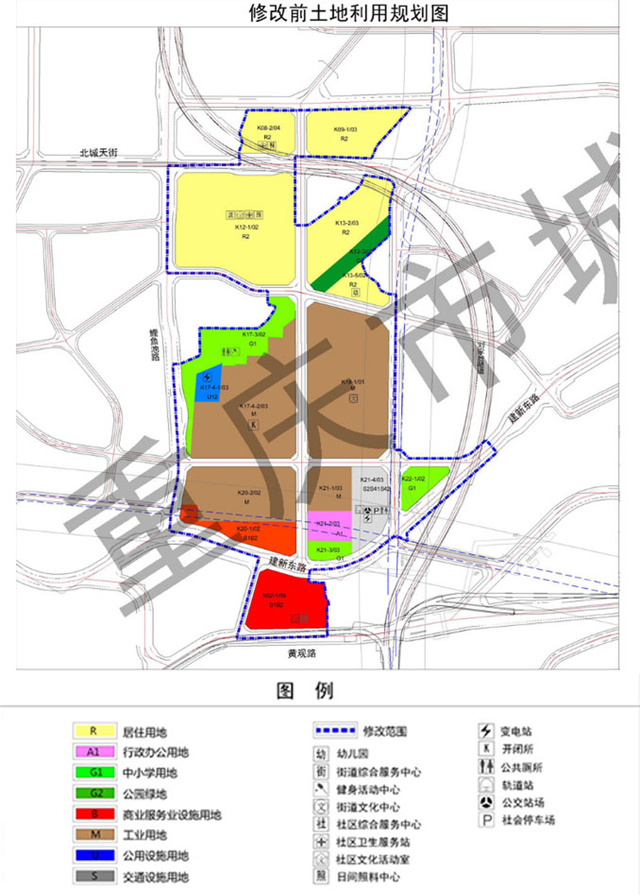 以鋼筋為例,我們可以通過長安三工廠片區(qū)項目估算一下,光是這一項拆出工程就能收入多少。根據(jù)重慶市規(guī)劃和自然資源局發(fā)布的相關(guān)城鄉(xiāng)規(guī)劃,可以看到長安三工廠片區(qū)修改前后的示意圖。如下圖所示,在修改前,該片區(qū)有約一半的區(qū)域為工業(yè)用地(褐色區(qū)域),另一半約為居住用地(黃色區(qū)域)。