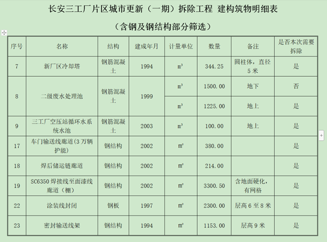 招標文件附件中的《建構(gòu)筑物明細表》顯示,本次拆除共計26項內(nèi)容,幾乎全部為“新廠區(qū)冷卻塔、三工廠空壓站循環(huán)水系統(tǒng)水池、焊后儲運鏈廊道”等工廠廠區(qū)構(gòu)建及附近道路。可見,本次一期拆除的范圍應(yīng)該集中在該片區(qū)的工業(yè)用地內(nèi)。
