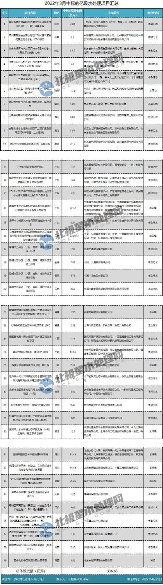 據(jù)統(tǒng)計(jì),2022年3月開(kāi)標(biāo)億級(jí)水處理項(xiàng)目39個(gè)(含部分預(yù)中標(biāo),不含上個(gè)月已統(tǒng)計(jì)的預(yù)中標(biāo),不含供水),涉及16大省份,總投資額336.63億元。