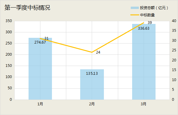 第一季度,開(kāi)標(biāo)的億級(jí)水處理項(xiàng)目共94個(gè),涉及總投資746億元,其中3月份的勢(shì)頭最盛。