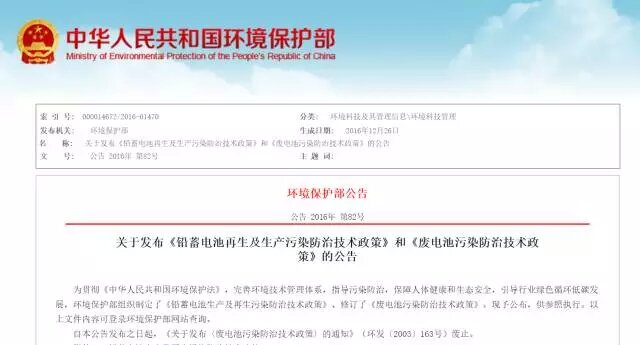 為貫徹《中華人民共和國(guó)環(huán)境保護(hù)法》,完善環(huán)境技術(shù)管理體系,指導(dǎo)污染防治,保障人體健康和生態(tài)安全,引導(dǎo)行業(yè)綠色循環(huán)低碳發(fā)展,環(huán)境保護(hù)部組織制定了《鉛蓄電池生產(chǎn)及再生污染防治技術(shù)政策》、修訂了《廢電池污染防治技術(shù)政策》。現(xiàn)予公布,供參照?qǐng)?zhí)行。以上文件內(nèi)容可登錄環(huán)境保護(hù)部網(wǎng)站查詢(xún)。