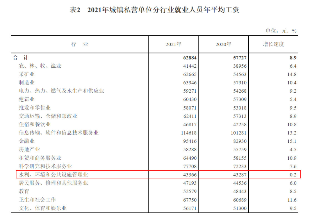最近兩年,每到4-5月份,環(huán)保行業(yè)日子似乎都不好過。4月前后,年報(bào)發(fā)布季,一大波環(huán)保企業(yè)出現(xiàn)虧損,不好過。5月下旬,國家統(tǒng)計(jì)局照例又要發(fā)布上一年度的平均工資數(shù)據(jù),環(huán)保行業(yè)經(jīng)常排名墊底,又不好過。這不,5月20日,國家統(tǒng)計(jì)局就公布了2021年度的平均工資數(shù)據(jù),環(huán)保行業(yè)首次實(shí)現(xiàn)了收入增速的“雙墊底”(私營單位+非私營單位),增速還不如飽受疫情和政策影響的教育、餐飲和房地產(chǎn)業(yè),實(shí)在令人汗顏。而回顧過去5年,城鎮(zhèn)私營單位環(huán)保行業(yè)的收入增速就一直排名倒數(shù)。2017年倒數(shù)第一,2018年倒數(shù)第一,2019年和2020年倒數(shù)第二,2021年再次倒數(shù)第一,三次“第一”兩次“第二”(全是倒數(shù)),可謂“收入增速增長最緩慢行業(yè)”。為什么出現(xiàn)這一狀況?與環(huán)保行業(yè)的基本屬性有關(guān)。作為一個(gè)關(guān)系國計(jì)民生的重要行業(yè),環(huán)保行業(yè)注定不可能暴利,其業(yè)績的一大特點(diǎn)就是經(jīng)常“增收不增利”,從業(yè)人員的收入自然也就比較低了。5月20日,國家統(tǒng)計(jì)局公布了2021年城鎮(zhèn)單位就業(yè)人員的平均工資數(shù)據(jù)。這項(xiàng)數(shù)據(jù)主要分為3個(gè)榜單——城鎮(zhèn)非私營單位就業(yè)人員年平均工資、城鎮(zhèn)私營單位就業(yè)人員年平均工資,以及規(guī)模以上企業(yè)就業(yè)人員年平均工資。我們主要看的是前兩個(gè)榜單,非私營單位和私營單位的。榜單根據(jù)《國民經(jīng)濟(jì)行業(yè)分類》(GB/T4754-2017)對(duì)各行業(yè)進(jìn)行了分類,環(huán)保行業(yè)屬于其中的“水利、環(huán)境和公共設(shè)施管理業(yè)”。今年的數(shù)據(jù),環(huán)保行業(yè)的最大特點(diǎn)是——首次實(shí)現(xiàn)了收入增速的“雙墊底”:非私營單位收入增速,環(huán)保行業(yè)3.0%,排名倒數(shù)第一;私營單位收入增速,環(huán)保行業(yè)0.2%,排名也是倒數(shù)第一。 而橫向?qū)Ρ绕渌袠I(yè),可以看到——都比環(huán)保行業(yè)好。都說房地產(chǎn)業(yè)這兩年日子不好過,可人家的收入增速也有4.5%;都說教育業(yè)因?yàn)椤半p減”涼涼了,可以人家的增速還有8.5%;都說住宿和餐飲業(yè)受疫情影響最大,可人家的增速竟然有10.8%。你說氣人不?整天哭著喊著的行業(yè)沒啥事,這邊一直默默無聞的環(huán)保行業(yè)一算賬卻來了個(gè)墊底。為啥環(huán)保行業(yè)的收入增速這么慢?官方給出的解釋是——隨著疫情防控成效顯現(xiàn),2021年大部分行業(yè)恢復(fù)性發(fā)展,但旅游業(yè)與景區(qū)收入恢復(fù)較慢,部分地區(qū)工資水平較低的環(huán)保、護(hù)林等公益性崗位增加較多,這些都拉低了水利環(huán)境和公共設(shè)施管理業(yè)的工資增長速度。