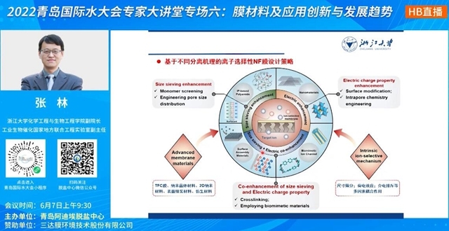 目前,無論是從鹵水提鋰、工業(yè)廢水分鹽資源化處理,還是從濃海水利用、飲用水鈣鎂選擇性去除等各方面來看,單/多價(jià)離子鹽分離需求的上漲都是可見的。“納濾是最具潛力的單多價(jià)陽離子分離技術(shù)之一”,張林副院長對(duì)基于不同分離機(jī)理的離子選擇性NF膜設(shè)計(jì)路徑進(jìn)行了分析,還介紹了新型膜材料。