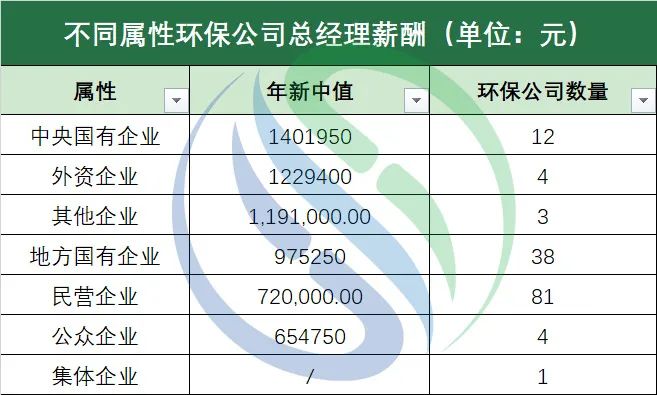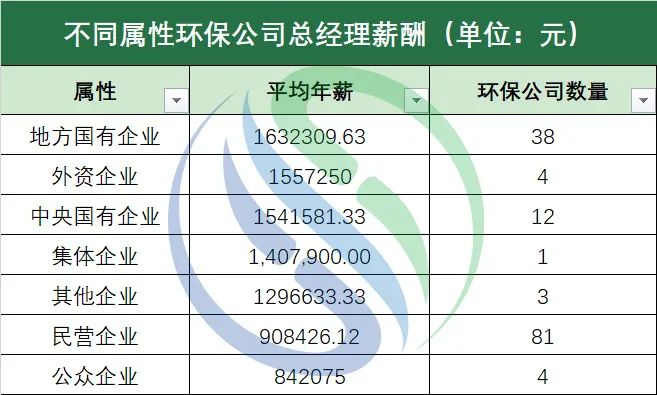 “固廢>水務”這一趨勢和過去兩年的環(huán)保上市公司業(yè)績趨勢一致。中國水網(wǎng)2020年與2021年的環(huán)保上市公司年報數(shù)據(jù)統(tǒng)計結(jié)果顯示,連續(xù)兩年,固廢處置行業(yè)的營業(yè)收入與凈利潤雙雙超過水務行業(yè)。近兩年隨著《“十四五”城鎮(zhèn)生活垃圾分類和處理設施發(fā)展規(guī)劃》、《“十四五”循環(huán)經(jīng)濟發(fā)展規(guī)劃》、《“十四五”時期“無廢城市”建設工作方案》等政策的出臺,帶動了固廢處置行業(yè)中環(huán)衛(wèi)、餐廚垃圾處理等細分領(lǐng)域的發(fā)展,從而在一定程度上影響了固廢處置行業(yè)環(huán)保上市公司總經(jīng)理們的年薪水平。不過水務行業(yè)的環(huán)保企業(yè)也不用太焦慮。進入“十四五”時期以來,《關(guān)于推進污水資源化利用的指導意見》、《“十四五”城鎮(zhèn)污水處理及資源化利用發(fā)展規(guī)劃》等一系列關(guān)于污水固廢資源化的政策頻繁出臺。在新建水務項目越來越少的情況下,國家也多次出臺措施助推存量資產(chǎn)盤活,為水務企業(yè)發(fā)展提供新的思路。此外,從事大氣治理、環(huán)保裝備制造、土壤修復與環(huán)境監(jiān)測等細分領(lǐng)域的企業(yè)隨著近年來國家政策的出臺,乘著政策紅利的東風,其市場規(guī)模也日益突顯,相繼迎來發(fā)展高峰。如,《2021-2030年大氣污染治理行業(yè)發(fā)展展望報告》數(shù)據(jù)顯示,預計2021-2025年大氣污染治理市場規(guī)模約為1.6-1.8萬億元;在環(huán)保裝備制造領(lǐng)域,工信部、科技部、生態(tài)環(huán)境部三部門于今年1月21日聯(lián)合印發(fā)的《環(huán)保裝備制造業(yè)高質(zhì)量發(fā)展行動計劃》提出,到2025年,環(huán)保裝備制造業(yè)產(chǎn)值要力爭達到1.3萬億元;再如第三方環(huán)境監(jiān)測運營市場也逐步釋放,2021年上半年共注冊5.0萬家環(huán)境監(jiān)測類企業(yè),同比增長72.4%……種種政策和市場需求創(chuàng)造的紅利為這些細分領(lǐng)域帶來了積極因素。無論管理層還是普通員工,都是企業(yè)發(fā)展的一個“齒輪”,個人收入的多少都與企業(yè)經(jīng)營狀況掛鉤。環(huán)境產(chǎn)業(yè)各細分領(lǐng)域市場潛力的釋放與從業(yè)者薪資水平正如月球牽引著潮汐,潮漲潮落,有跡可循。筆者按照wind的分類,將143家環(huán)保公司分為中央國有企業(yè),地方國有企業(yè)、集體企業(yè)、民營企業(yè)、公眾企業(yè)、外資企業(yè)和其他企業(yè)七大類。根據(jù)統(tǒng)計數(shù)據(jù)顯示,地方國有企業(yè)以163.23萬元的總經(jīng)理平均年薪位列第一,外資企業(yè)和中央國有企業(yè)分別位列第二、三位,其總經(jīng)理平均年薪分別為155.73萬元和154.16萬元。前三整體年薪水平差距不大。