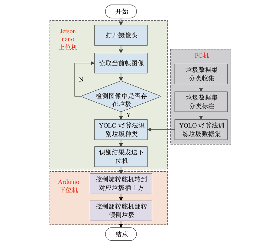 上位機識別程序利用YOLO v5模型進行垃圾分類識別,采用Jetson Nano作為上位機來運行程序,識別完成后將識別結果通過串口發(fā)送給下位機Arduino ,并進行相關動作。由于垃圾箱內識別區(qū)是相對封閉穩(wěn)定的區(qū)域,光照基本不變、識別背景穩(wěn)定,給高精度識別帶來了便利。