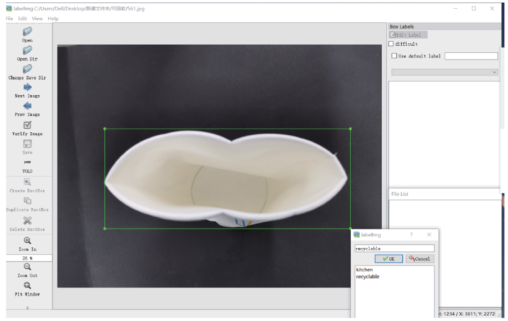 本設計以常見垃圾為例,尤其針對非住宅區(qū)的公共場所(如地鐵站﹑火車站、學校等場所)所產(chǎn)生的垃圾為例進行算法研究,收集的常見垃圾數(shù)據(jù),包括食品包裝紙、礦泉水瓶、飲料瓶、易拉罐、塑料盒、電池、水果皮核、干果殼等。每一小類采集了約100張數(shù)據(jù),包括不同拍攝角度,不同腐壞程度等,共采集了4000張數(shù)據(jù),其中 3500張用于訓練,500張用于測試。再將每小類劃分到廚余垃圾、可回收垃圾、有害垃圾以及其他垃圾中。部分不同垃圾的真實訓練數(shù)據(jù)集如圖6所示。標注工具采用LabelImg 軟件進行標注,標注過程如圖7所示。