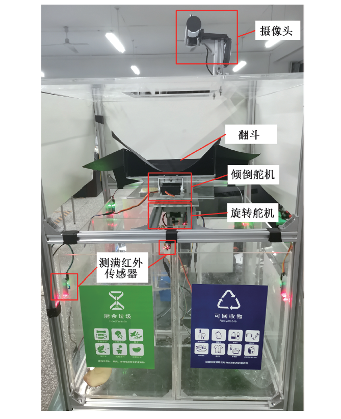 目前智能垃圾箱有多種形式,主要分為聲控方式和視覺方式2類。聲控方式需要投放者對著垃圾箱說出垃圾的名稱,垃圾箱判定該垃圾所屬類別后打開相應垃圾箱,完成投放,如馬浚剛等設計了一種基于STM32單片機的語音識別智能垃圾箱,利用語音識別模塊ASR-MO8B、語音播報模塊WT2003S-16和sG90模擬舵機實現(xiàn)垃圾箱的智能化聲音識別,并且能語音控制對應垃圾箱垃圾蓋的自動開閉;趙小芬基于語音識別算法,并將其應用于垃圾分類,開發(fā)了一種軟硬件結合的嵌入式智能垃圾箱。基于視覺方式主要是采用目標檢測識別的方法進行垃圾識別和分類,識別過程主要包括圖像預處理,特征提取和分類3個步驟,依據(jù)特征提取方式可分為傳統(tǒng)機器學習方法和深度學習方法。傳統(tǒng)機器學習方法是針對圖像提取其特征并進行匹配篩選,確定目標種類,如黃浩然對采集到的垃圾圖像提取Hu不變矩和12個顏色空間特征作為特征向量,對比特征向量之間的相似性來確定垃圾種類;黃興華等通過改進局部二值模式(LBP)紋理特征算法,結合梯度方向直方圖(HOG)算法,提出一種新的特征融合方法,并利用支持向量機(SVM)進行垃圾分類識別; Irfan等采用Haar-Cascade方法檢測地板上的物體并將灰度共生矩陣(GLCM)和定向梯度直方圖(HOG)結合起來得到1組特征,利用支持向量機( SVM)將物體進行垃圾分類。深度學習法垃圾分類是利用近年來較流行的深度學習模型進行垃圾識別,如 Wang等提出的通過使用區(qū)域提議網(wǎng)絡和 ResNet 網(wǎng)絡算法訓練Faster R-CNN開源框架,再通過 RPN(區(qū)域提議網(wǎng)絡)層得到輸出; Kumar等研究了YOLO v3算法在Darknet神經(jīng)網(wǎng)絡框架中用于訓練自制數(shù)據(jù)集,針對6種對象類別(紙板﹑玻璃、金屬、紙張﹑塑料和有機廢物)進行了訓練,使用YOLO v3-tiny執(zhí)行了檢測任務,以驗證YOLO v3算法的能力,結果表明:所提出的YOLO v3方法對具有一定的泛化能力。還有部分學者也進行了相關研究。