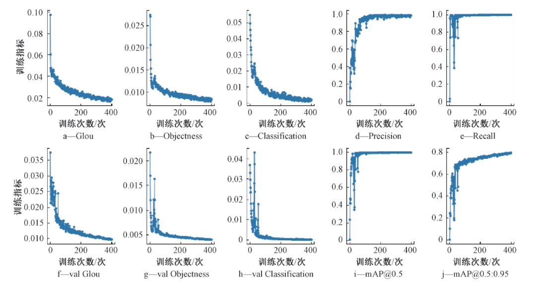 圖9反映了隨著次數(shù)增加,訓練指標的變化趨勢。總訓練次數(shù)為400輪。其中, GIoU為訓練數(shù)據(jù)集模型的損失函數(shù);Objectness為目標的損失函數(shù)均值,值越小目標檢測越準確;Classification為分類的損失函數(shù)均值,值越小目標檢測越準確;Precision表示精度;Recall表示召回率。從圖9可以看出:隨著訓練次數(shù)的增加,精度和召回率在不斷升高,最終穩(wěn)定在接近100%的數(shù)值附近; f~h前面加了val,表示為驗證數(shù)據(jù)集的結果;mAP表示mean AveragePrecision , 即平均精度, mAP@ 0.5參數(shù)為損失函數(shù)設為0.5時,每一類圖片的AP值的平均; mAP@ 0.5 :0.95表示損失函數(shù)在步長為0.5、范圍在0.5~0.95閾值下的平均mAP。從圖9中可以看出,當訓練達到80輪左右時, mAP@ 0.5上升到了1.0 , mAP@ 0.5∶0.95上升到了0.7左右,并且隨著訓練輪數(shù)的增加不斷提高,最終達到0.8左右,訓練精度較高。