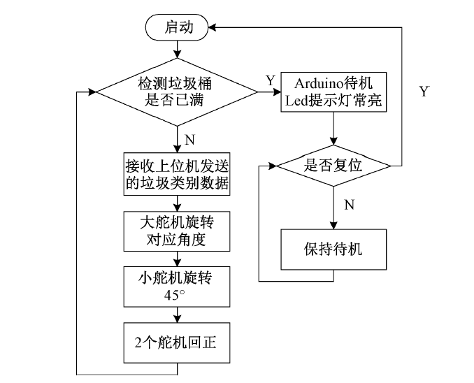 下位機軟件工作流程如圖5所示。首先啟動Arduino,通過光電傳感器與紅外發(fā)射器模塊判斷垃圾桶是否已滿。若垃圾桶已滿,向上位機發(fā)送已滿信號、點亮Led燈同時進入待機狀態(tài)。若垃圾桶未滿,則Arduino接收上位機信號,信號0、1、2、3分別對應廚余垃圾、可回收垃圾、有害垃圾、其他垃圾,Arduino與上位機Jetson Nano 之間的通信通過ASCII碼傳輸,對應接收到的值為48、49、50、51 ,通過對這4個值的判斷,來控制舵機模塊準確將垃圾投進對應的垃圾箱。大舵機對應不同種類垃圾,0號垃圾桶逆時針旋轉45°,1號垃圾桶順時針旋轉45°,2號垃圾桶順時針旋轉135°,3號垃圾桶逆時針旋轉135°,從而將云臺對準相應的垃圾桶,之后小舵機旋轉30°將翻斗抬起,將垃圾準確迅速地投入垃圾桶。2個動作完成后,2個舵機分別回到初始0°狀態(tài)。投放完畢后﹐翻斗、云臺分別回正,同時檢測垃圾桶是否已滿,并重復上述步驟。