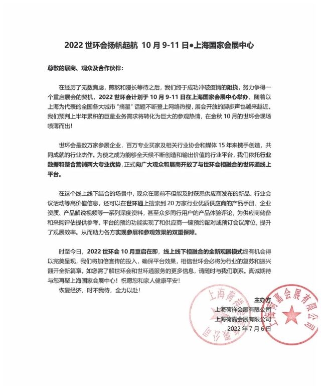 原標(biāo)題:【新展期確定】2022世環(huán)會(huì)揚(yáng)帆起航,金秋10月共聚國(guó)家會(huì)展中心
