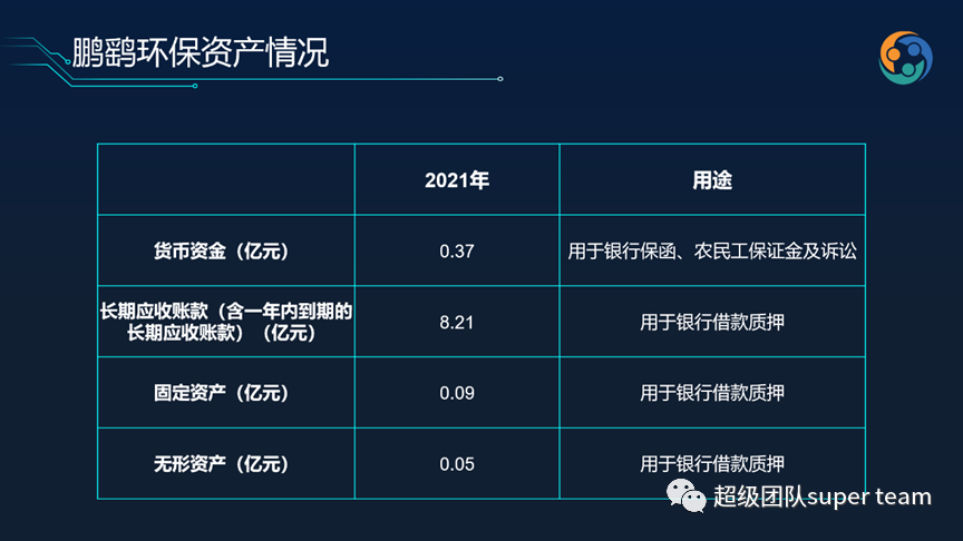 截至2021年底,鵬鷂環(huán)保貨幣現(xiàn)金有4.47億,但短期借款有6.77億,長(zhǎng)期借款有7.18億,還有一年內(nèi)到期的長(zhǎng)期借款有1.2億,貨幣現(xiàn)金只能覆蓋短期還款。鵬鷂環(huán)保多個(gè)資產(chǎn)科目還存在抵押或質(zhì)押的情況,受限資產(chǎn)金額約15億,占總資產(chǎn)比例約1/2。