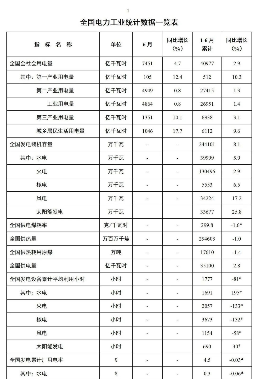 1-6月份,全國發(fā)電設(shè)備累計平均利用1777小時,比上年同期減少81小時。其中,火電2057小時,比上年同期減少133小時;核電3673小時,比上年同期減少132小時;風(fēng)電1154小時,比上年同期減少58小時。