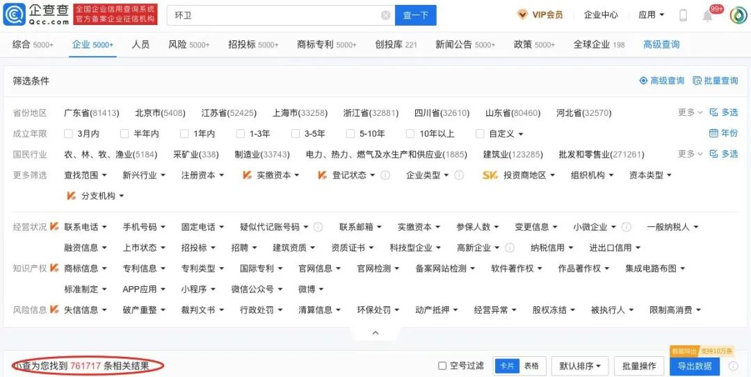 圖1 企查查顯示,全國(guó)共有761712家環(huán)衛(wèi)相關(guān)企業(yè)