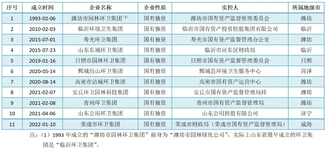 山東省共有16個(gè)地級(jí)市,企查查數(shù)據(jù)顯示,所有地級(jí)市均有國(guó)企涉足環(huán)衛(wèi)領(lǐng)域,但以“環(huán)衛(wèi)集團(tuán)”命名,具備一定規(guī)模和知名度,且以本地環(huán)衛(wèi)作業(yè)單位為基礎(chǔ)改制而來的環(huán)衛(wèi)企業(yè)則只有11家。如表2所示。
