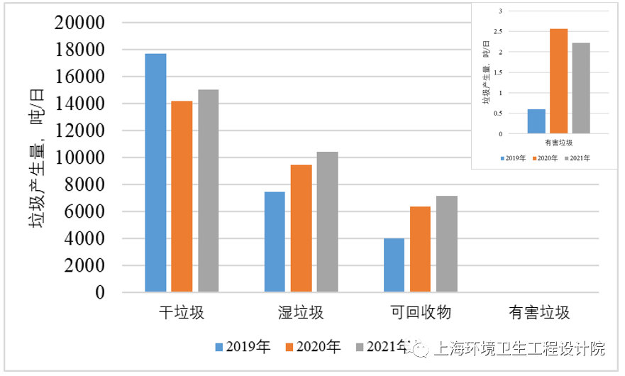 《條例》實施以來,生活垃圾呈現(xiàn)“三增一減”。據(jù)上海市綠化市容局公布的數(shù)據(jù)表明(圖1),隨著垃圾分類工作不斷推進,濕垃圾分出量、可回收物回收量逐年上升。2021年度,濕垃圾分出量已超過10000噸/日,占干、濕垃圾總量40%左右,可回收物回收量基本穩(wěn)定在日均7000噸左右,有害垃圾分出量日均2噸以上。