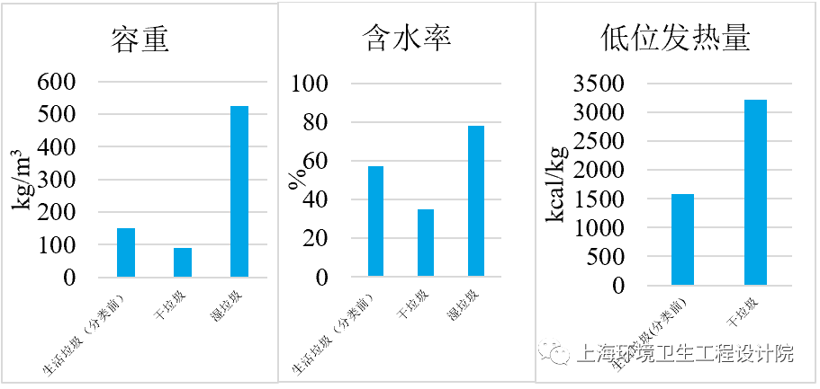 生活垃圾物理組成的變化導(dǎo)致其密度、含水率發(fā)生顯著變化。《條例》實施前,生活垃圾容重、含水率分別為151 kg/m3、56.96%,低位發(fā)熱量約1580 kcal/kg?!稐l例》實施后,相比于混合投放,干垃圾容重、含水率均下降約40%,且其低位發(fā)熱量則增到3210 kcal/kg;濕垃圾主要為廚余類,相比于混合投放,容重增加約247%,含水率增加約37%。干、濕垃圾容重之比約為1∶6,含水率之比約為9∶20。