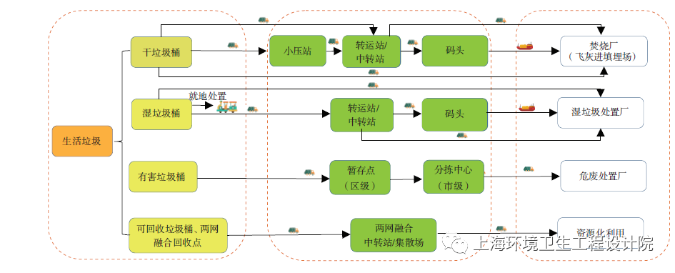 《條例》實施后,垃圾分類收集運輸、分類處理體系能否適應(yīng)前端分類垃圾理化特性變化是目前環(huán)境衛(wèi)生工程領(lǐng)域的一大科學(xué)問題。目前,干垃圾通過直運或經(jīng)中轉(zhuǎn)站及碼頭壓縮轉(zhuǎn)運至焚燒廠;濕垃圾采用就地就近處理,或直運或經(jīng)中轉(zhuǎn)站運輸至濕垃圾處理廠集中處理。分類垃圾理化特性變化對生活垃圾收運、處置均產(chǎn)生一定影響。