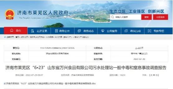 并且前幾天,山東省濟(jì)南市萊蕪區(qū)公布了“6?23”山東省萬興食品有限公司污水處理站一般中毒和窒息事故調(diào)查報告。