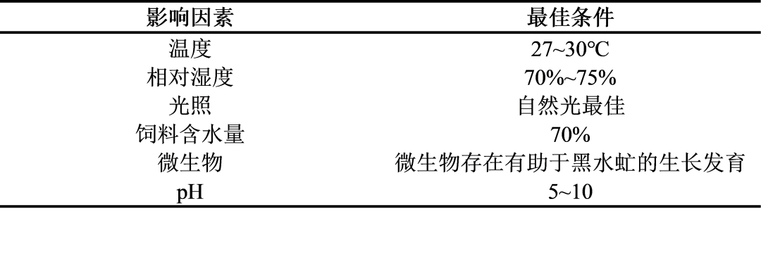(1)溫度:黑水虻幼蟲的最適生長發(fā)育溫度是27~30℃。低于26℃成蟲不產(chǎn)卵,而溫度過高會(huì)導(dǎo)致幼蟲停止攝食。