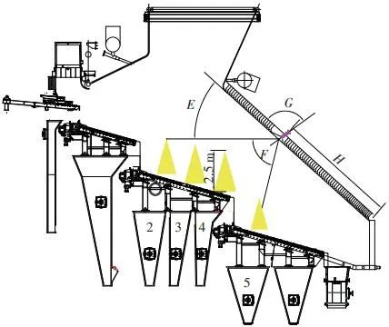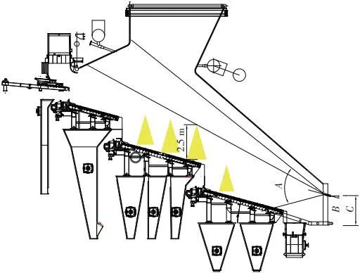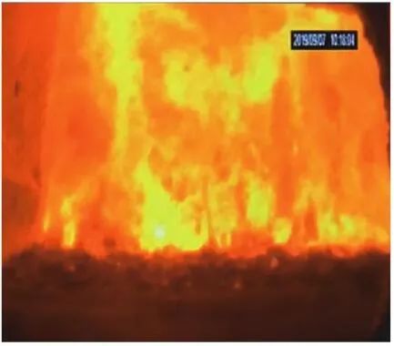 當前生活垃圾焚燒爐廣泛采用的爐膛火焰監(jiān)視系統(tǒng)基本上都是由早期應用在水泥廠、鋼鐵廠的加熱爐、退火爐和氧化鋁廠等行業(yè)內的高溫看火工業(yè)電視演變升級而來。內窺式數(shù)字高清爐膛火焰監(jiān)視系統(tǒng)成像裝置主要由耐高溫針孔電動鏡頭、寶石物鏡、光學濾光片、光圈焦距調節(jié)器等組成,配有電控推進器、氣源控制柜、光端機等輔助設備。其核心問題是如何在生活垃圾焚燒爐的高溫、多塵、強腐蝕環(huán)境中長周期穩(wěn)定運行,保證火焰畫面不丟包、不失真。1)優(yōu)勢特性分析。一是技術成熟、運行穩(wěn)定。隨著我國近一二十年間生活垃圾發(fā)電廠的興建,爐膛火焰監(jiān)視系統(tǒng)的技術也處于不停地優(yōu)化和迭代之中,目前已能滿足穩(wěn)定、可靠的要求。其中常規(guī)配置參數(shù)為攝像頭300 萬像素,響應時間2 s,光圈(F數(shù))1.6,焦距2.4 mm。二是工作環(huán)境好。爐膛火焰監(jiān)視器探頭通常安裝于焚燒爐后墻,所處位置是垃圾燃燒最末端,常規(guī)工況下探頭周圍煙氣溫度通常<600 ℃。較之焚燒爐其他高溫環(huán)境已算“宜居地帶”。三是維護量小。焚燒爐后墻幾乎沒有結焦現(xiàn)象,常規(guī)爐膛火焰監(jiān)視探頭開孔位置僅存有因爐膛偶爾正壓時煙氣外冒造成的積灰,積灰量不大,清理工作較為輕松。2)劣勢特性分析。一是參數(shù)單一。因垃圾焚燒行業(yè)爐型構造和燃燒成分的特殊性,垃圾焚燒爐長期采用的火焰探頭利用的是光學成像原理,運行人員僅能通過觀察火焰形狀和位置來判斷焚燒爐工況,無法得到多維度參數(shù)。二是視角局限。爐膛火焰探頭通常位于焚燒爐后墻,安裝角度朝向爐內成斜向上方向,與水平線夾角15°左右,探頭視場角通常>60°。以某大型列動順推爐排焚燒爐為例,在此仰視角度下可以看到爐排燃燒段尾部、燃燼段前部兩面明顯的火焰幕墻,由于火焰鋒面遮擋,很難觀察到燃燒段中前部的火焰狀況。 以某單臺750 t/d大型列動順推爐排焚燒爐中爐膛火焰監(jiān)視器安裝位置和顯示畫面為實例,具體分析火焰成像狀態(tài)。其實際火焰成像畫面見圖1。成像角度是由焚燒爐后墻探頭位置向上仰視爐膛。因焚燒工況十分良好,靠近后墻的燃燼段區(qū)域幾乎沒有明火,燃燒段尾部成一面豎直、光亮的黃紅色火焰鋒面,高度約為2.5 m。對應的爐膛火焰監(jiān)視器安裝示意如圖2所示。爐膛火焰探頭安裝在焚燒爐后墻,安裝位置與后墻觀火平臺地面距離為C(m)。開孔傾角與水平方向夾角為B(°),有效視場角為A(°)。圖2中由黃色填充的三角形區(qū)域代表正常燃燒火焰,其中標注高度2.5 m的區(qū)域為燃燒爐排尾部火焰,即為圖1所顯示的火焰鋒面。顯然,從爐膛火焰監(jiān)視器向上望去,燃燒段前部、中部火焰為視野盲區(qū)。由于被燃燒段尾部火焰鋒面遮擋,通過火焰監(jiān)視器通常只能看到燃燒段尾部、燃燼段前部這兩個區(qū)域的火焰。