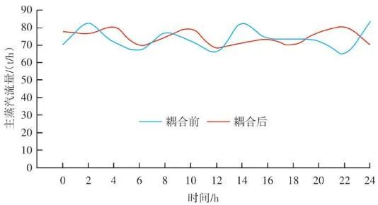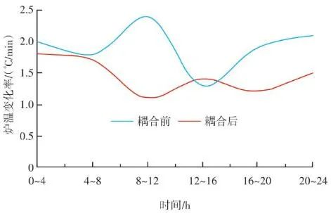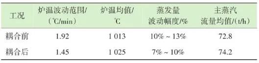 根據(jù)工藝設計和焚燒爐結構,從燃燒段至燃燼段前部為垃圾的燃燒區(qū)域,爐排底部依次有4行風室,即圖7中所示2、3、4和5行風室,每行各有3列,共計12個風室。按照前述的項目實例,圖6中的12個紅外溫度測點,可以得到依次對應12個風室上部的火焰圖像和燃燒溫度。在傳統(tǒng)ACC系統(tǒng)中,一次風的理論供風量主要依據(jù)垃圾熱值、垃圾占比、蒸發(fā)量設定值、鍋爐熱效率等參數(shù)計算得到,在得到理論計算值后,會根據(jù)鍋爐負荷、垃圾料層厚度、垃圾濕度、燃燒和燃燼段上部溫度等參數(shù)的波動對理論計算值進行修正。其中溫度參數(shù)是由安裝在焚燒爐墻兩側的熱電偶反饋而來,爐溫熱電偶的長度一般為1.0~1.3 m,除去爐墻壁厚,熱電偶露出爐內的長度一般在250 mm左右,熱電偶材質為鎳鉻-鎳硅,熱電偶前端耐磨頭長度為250~300 mm,耐磨頭材質為鈷60。由于能夠反饋的溫度只能是熱電偶周圍溫度,因此會造成3點限制:①測點數(shù)量有限,若熱電偶數(shù)量增加,鍋爐開孔數(shù)量也要隨之上升,通常燃燒和燃燼區(qū)域安裝熱電偶數(shù)量為4~6支;②耦合性較高,抗干擾能力較低,其中的溫度修正系數(shù)雖然權重占比不大,但由于熱電偶數(shù)量有限,其單一溫度值對整體其他區(qū)域有連鎖影響,因此局部溫度與局部風量無法一一獨立對應;③準確性存在衰減,熱電偶的原理是溫度信號轉換成熱電動勢信號,通過二次儀表呈現(xiàn)被測介質溫度。而隨著磨損、腐蝕的加重,其準確性也逐漸衰減。其中鎳硅合金中的硅和鎳的優(yōu)先氧化是引起鎳鉻-鎳硅熱電偶熱電動勢超差、準確性降低的主要原因。根據(jù)上述內容,我們在得到理論計算風量之后,針對每一段風室進行獨立的風量修正。圖9中:M為對應區(qū)域內溫度設定值(℃);H為垃圾層厚度偏差百分比(%);P為對應區(qū)域內溫度實時反饋值(℃);K為對應區(qū)域內溫度變化率(℃/min);√ ̄為速度變化率高低限范圍(℃/min);LCUT為低切保護模塊(℃);LAG為高階濾波模塊(℃);A為理論計算風量(m3/h);B為實際輸出計算風量(m3/h)。如圖9所示,X區(qū)域實時反饋溫度經(jīng)過低切保護模塊LCUT和濾波模塊LAG后,與預設值M進行比較,計算的差值進入溫度-風量折算函數(shù)F(x)。同時根據(jù)溫度上升和下降的速度變化率K,對函數(shù)的輸出速率進行擾動,改變其響應速度。首先X區(qū)域的理論計算風量是耦合前原有ACC系統(tǒng)通過垃圾熱值、垃圾占比、鍋爐蒸發(fā)量、氧氣含量、鍋爐焓值等一系列參數(shù)計算出來的爐排下一次風支管風量,是實時變化的動態(tài)數(shù)值,而X區(qū)域的溫度預設值M與反饋值P的差值反映的是X區(qū)域內垃圾焚燒過于劇烈,還是處于未完全燃燒狀態(tài)。因為垃圾焚燒過程的復雜性,可以做出以下關系函數(shù):一方面在爐內垃圾層厚度等于或大于理論的標準厚度前提下,當X區(qū)域溫度M大于P則風量減少,當X區(qū)域溫度M小于P則風量增加,當X區(qū)域溫度M等于P則保持原有ACC計算風量不變,此時選擇公式F1(x)內部函數(shù);另一方面在爐內垃圾層厚度小于標準厚度前提下,此時判斷料層過薄,風量太大容易出現(xiàn)燒空、燒斷料的情況,因此當M與P的差值為正數(shù)或負數(shù)時都會適當減少風量,但根據(jù)溫度的高或低對應減少風量的幅度會不同,此時利用F2(x)內部函數(shù)。12個溫度劃分區(qū)域都基于此耦合邏輯,具體設定參數(shù)適時調整。通過干擾獨立配風的風量,達到改變整個焚燒爐一次風風量的效果。生活垃圾焚燒爐的排放物在滿足GB 18485—2014 生活垃圾焚燒污染控制標準的前提下,為保障焚燒爐的長期安全運行、汽機系統(tǒng)的穩(wěn)定高效運轉,通常通過爐溫和主蒸汽流量這兩個因素來判斷鍋爐運行是否良好。以下工況為某項目單臺750 t/d生活垃圾焚燒爐在紅外熱成像管理系統(tǒng)應用前、應用后兩段時期的實際運行參數(shù),以此實例來解析該系統(tǒng)的運行效果。該項目額定主蒸汽流量為74 t/h。如圖10所示,藍色實線為耦合前24 h變化率波動范圍,紅色實線為耦合后24 h變化率波動范圍。爐溫變化率指的是焚燒爐上、中、下3層共計9個溫度測點的熱電偶反饋溫度在每分鐘內升高或降低的溫度值,而溫度變化率波動范圍指的是單位時間內溫度變化率最高值與最低值之間的溫度差,該差值越大表明爐溫波動越大,即工況越不穩(wěn)定,波動范圍越小表明工況越平穩(wěn)。此期間溫度也一直未低于環(huán)保部要求的最低限(850 ℃/2 s),均介于950~1 050 ℃。焚燒爐主蒸汽流量曲線如圖11所示,左側縱坐標為主蒸汽流量,額定蒸發(fā)量74 t/h。圖中藍色實線為紅外熱成像系統(tǒng)與ACC系統(tǒng)耦合前24 h的主蒸汽流量曲線,紅色虛線為紅外熱成像系統(tǒng)與ACC系統(tǒng)耦合后24 h的主蒸汽流量曲線。表1中參數(shù)可以計算出耦合前后焚燒爐爐溫波動范圍相對縮減了24.5%,焚燒爐爐溫均值提高了1.2%,蒸發(fā)量波動幅度縮減了3個百分點,主蒸汽流量提高了1.4 t/h。經(jīng)過對主要運行參數(shù)的定量分析,可以看出結合了紅外熱成像系統(tǒng)的ACC系統(tǒng)在功能性和穩(wěn)定性上有顯著提升。基于目前紅外熱成像管理系統(tǒng)的功能,正在逐步進行焚燒爐溫度場重構工作,對于紅外探頭收集的大量溫度點實時數(shù)據(jù)進行整合并進行紅外溫度顯示。傳感器擁有1 440×1 0