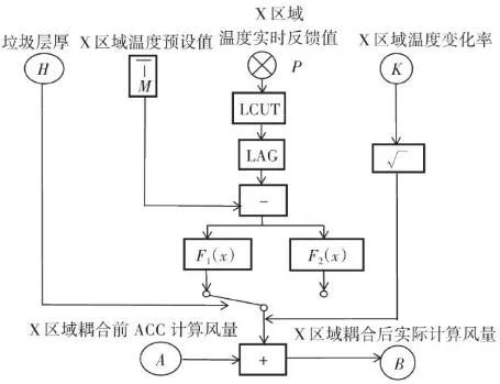 ACC系統(tǒng)是以理論計算設計為基礎,以鍋爐主蒸汽流量為核心控制目標,以垃圾料層厚度、一次風系統(tǒng)母管壓力、爐排下各風室一次風流量、燃燒和燃燼爐排上部溫度(熱灼減率)、氧氣濃度等參數(shù)為次要控制目標,以垃圾熱值和占比動態(tài)測量為給料量核算依據(jù),通過改變給料量和供風量的手段,來實現(xiàn)運行人員的極少干預。其中供風量的調整,主要閉環(huán)調節(jié)是以主蒸汽量的變化為最高權重。而溫度控制(燃燒和燃燼段上部熱電偶溫度變化值)作為輔助的閉環(huán)調節(jié)之一,權重占比較輕,約占5%~10%。