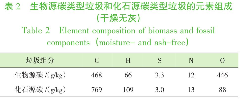由Fellner團(tuán)隊(duì)基于歐洲垃圾組分測(cè)得的生物源碳類型垃圾包括:木材、紙張/紙板、花園(庭院)和公園垃圾、廚余垃圾、衛(wèi)生紙、紡織品等;化學(xué)源碳類型垃圾包括:聚乙烯(Polyethylene,PE)、聚丙烯(Polypropylene,PP)、聚苯乙烯(Polystyrene,PS)、聚氯乙烯(Polyvinyl chloride,PVC)、聚對(duì)苯二甲酸乙二醇脂(Ethylene terephthalate,PET)、聚酰胺(Polyamide,PA)等,與IPCC法、CDM法垃圾組分的分類類型基本一致,是在全球范圍內(nèi)都具有參考性的分類標(biāo)準(zhǔn)。且生物源碳和化石源碳中的各種類型的垃圾元素組成及其含量差距不大,因此歐洲的數(shù)據(jù)具有一定的代表性,可用于表征我國(guó)垃圾組分的元素特點(diǎn),本研究參考了文獻(xiàn)【25】中的數(shù)據(jù)以試驗(yàn)平衡法在我國(guó)的適用性,具體數(shù)值見表2。