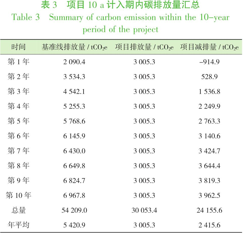 由CCER方法學(xué)計(jì)算可得,10 a計(jì)入期內(nèi)項(xiàng)目平均每年基準(zhǔn)線排放量為5420.9 tCO2e,總項(xiàng)目排放量為3005.3 tCO2e,總減排量為2415.6 tCO2e。計(jì)算得出10 a計(jì)入期內(nèi)的項(xiàng)目碳排放量如表3所示。計(jì)入期內(nèi)單位垃圾采用焚燒方式處理后的基準(zhǔn)線排放量為0.53 tCO2e/t,項(xiàng)目碳排放量約為0.29 tCO2e/t,碳減排量0.24 tCO2e/t。