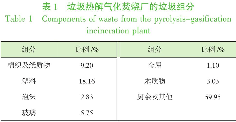 以舟山市某垃圾無(wú)害化處理項(xiàng)目為研究對(duì)象,該項(xiàng)目的垃圾焚燒系統(tǒng)采用立式旋轉(zhuǎn)熱解氣化焚燒爐對(duì)周邊城市生活垃圾及部分工業(yè)可燃垃圾進(jìn)行焚燒處理,處理規(guī)模為28 t/d,無(wú)須添加輔助化石燃料;并配建1.8 t/h臥式余熱鍋爐,給水量1.854 t/h,給水溫度20℃,蒸汽壓力0.7 MPa,蒸汽溫度170℃;項(xiàng)目渣產(chǎn)量為3.1 t/d,灰產(chǎn)量為1.44 t/d;垃圾滲瀝液產(chǎn)量為3.5 m3/d,其CODcr濃度為6000 mg/L,垃圾滲瀝液回噴至焚燒爐內(nèi)進(jìn)行處理。該項(xiàng)目新鮮垃圾的含水率為60%,詳細(xì)入爐垃圾組份見表1。