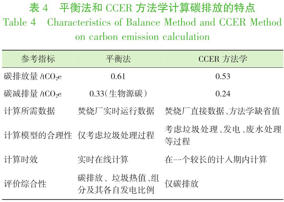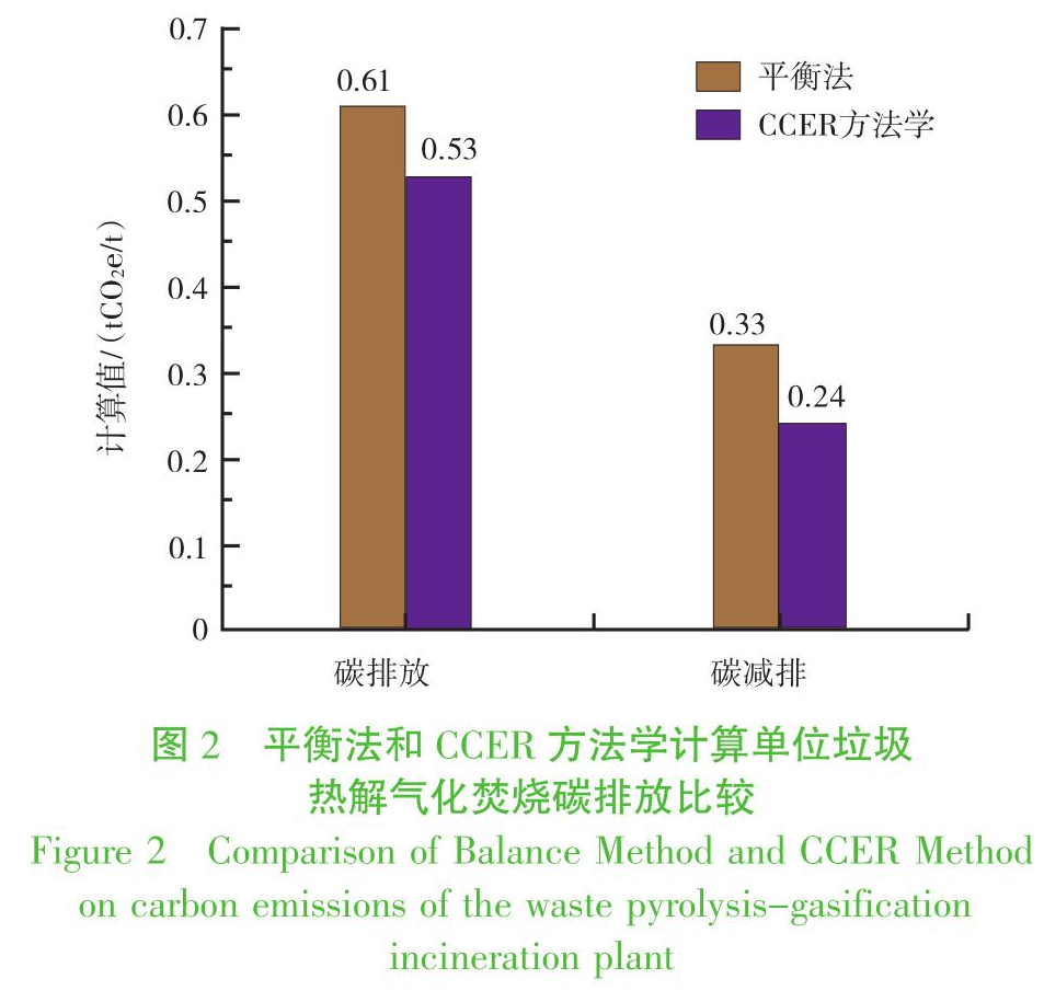 以舟山市某垃圾熱解氣化焚燒廠為例,分別采用平衡法和CCER方法學(xué)對(duì)該廠中的碳排放和碳減排量進(jìn)行了對(duì)比計(jì)算。由平衡法計(jì)算得該廠單位垃圾碳排放量為0.61 tCO2e/t,其中,化石源碳燃燒產(chǎn)生的碳排放量為0.28 tCO2e/t,生物源碳碳排放為0.33 tCO2e/t(該部分可產(chǎn)生碳減排效益);CCER方法學(xué)計(jì)算所得的基準(zhǔn)線排放量為0.53 tCO2e/t,項(xiàng)目排放量為0.29 tCO2e/t,項(xiàng)目減排量為0.24 tCO2e/t。兩種方法學(xué)的計(jì)算結(jié)果基本一致。平衡法可以對(duì)CCER方法學(xué)中項(xiàng)目排放量的垃圾焚燒產(chǎn)生的排放項(xiàng)進(jìn)行補(bǔ)充,同時(shí)是一種簡(jiǎn)便快捷、準(zhǔn)確性高,價(jià)格低廉的碳排放在線分析的可行方法。但仍需對(duì)我國(guó)垃圾組分進(jìn)行特定分析以完善平衡法。
