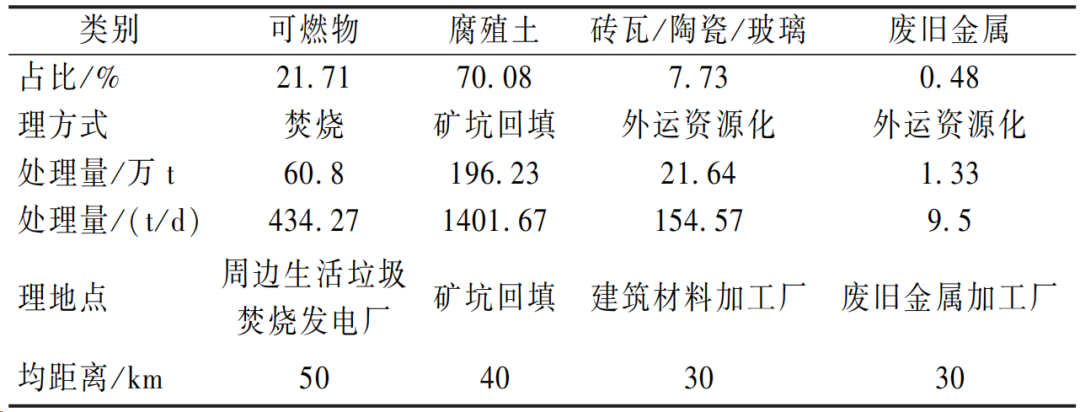 填埋場垃圾總量為 280 萬t,其中紙類、橡塑類、紡織類、木竹類屬于可燃物,占比 21.71%,合 60.8 萬t,磚瓦玻璃金屬為可直接資源化利用的比例為 7.73%,合 22.97 萬t,混合類(腐殖土)占比 70.08%,196.23 萬t(表4)。根據(jù)生活垃圾焚燒發(fā)電廠規(guī)模進行反推,每天可處理可燃物 600 t,占處理規(guī)模的 21.71%,考慮不確定性因素,每天開挖和篩分規(guī)模定為 2000 t。