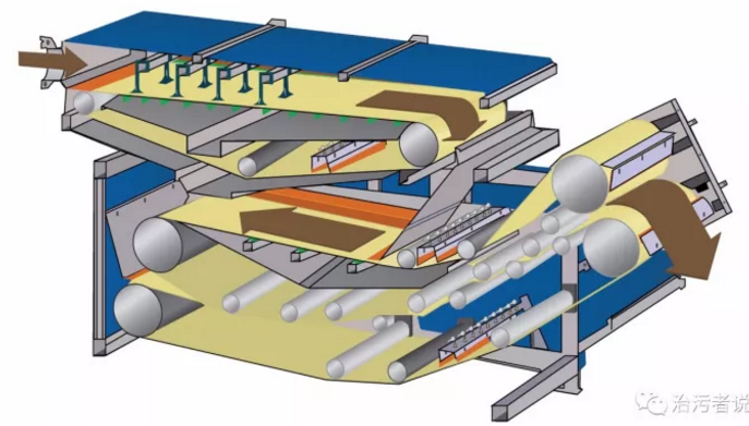 這是一個(gè)典型的濃縮壓濾一體機(jī)的構(gòu)造圖,從污泥濃縮壓濾一體機(jī)的結(jié)構(gòu)上來看,壓濾機(jī)分為三個(gè)部分,一部分是重力區(qū),在這個(gè)區(qū)間,主要是加了絮凝劑的污泥在污泥平攤輥的作用下,平攤到壓濾機(jī)上部平整的濾帶上,這部分濾帶沒有擠壓作用,僅僅是依靠加藥后的污泥和水分離開,水依靠重力作用通過濾帶流走的;第二部分進(jìn)入漸變區(qū),這個(gè)區(qū)域,開始有了第二條濾帶參與進(jìn)來,污泥開始進(jìn)入到一個(gè)上下兩條帶之間的位置,并逐漸受到上下兩條濾帶的包圍,并由寬變窄,形成一個(gè)漸變的區(qū)域,在這部分區(qū)域的污泥之間的水分在漸變的過程中得到一定的去除;第三部分進(jìn)入壓力區(qū),這部分濾帶上下開始強(qiáng)力擠壓,污泥中被絮凝藥劑剝離的顆粒之間的水分在壓力作用下從污泥中擠壓出去,通過濾帶流走。