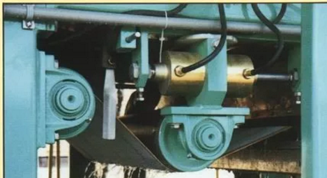 在脫水機(jī)的濾帶兩側(cè),各裝有一個(gè)限位開關(guān),和濾帶保持一定的距離,在濾帶碰觸到限位開關(guān)以后,限位開關(guān)給糾偏氣缸的空氣電動(dòng)閥一個(gè)開啟信號(hào),糾偏氣缸開始動(dòng)作,推動(dòng)糾偏輥?zhàn)樱瑸V帶在糾偏輥?zhàn)拥膸?dòng)下,回歸到正常的位置,完成一次完整的糾偏。帶式壓濾脫水機(jī)在運(yùn)行中,不斷的進(jìn)行糾偏動(dòng)作,對(duì)跑偏的濾帶進(jìn)行糾偏,從而保證了帶式壓濾機(jī)的正常穩(wěn)定的運(yùn)行。
