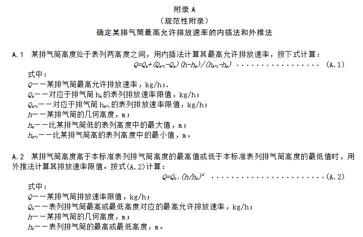 4.3.3.2若某排氣筒高度處于本標(biāo)準(zhǔn)列出的兩個(gè)值之間,其執(zhí)行最高允許排放速率以內(nèi)插法計(jì)算,內(nèi)插法的計(jì)算公式參見附錄A;當(dāng)某排氣筒的高度大于或小于本標(biāo)準(zhǔn)列出的排氣筒高度最大值或最小值時(shí),以外推法計(jì)算其最高允許排放速率,外推法計(jì)算公式參見附錄A。