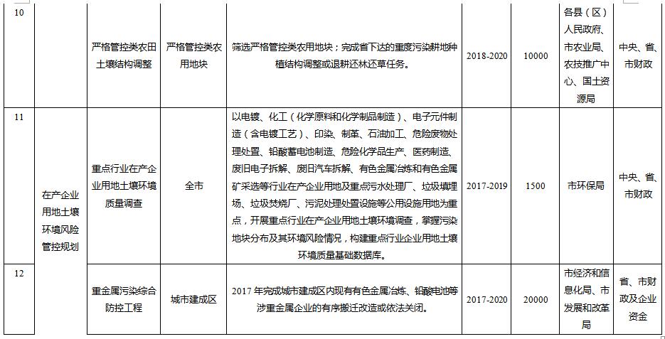規(guī)劃從惠州市農(nóng)用地土壤分區(qū)分類管控與治理修復(fù)、在產(chǎn)企業(yè)用地土壤環(huán)境風(fēng)險(xiǎn)管控、關(guān)閉搬遷企業(yè)地塊土壤治理與修復(fù)、垃圾填埋場(chǎng)及周邊環(huán)境整治、工業(yè)園區(qū)風(fēng)險(xiǎn)防范、未利用地保護(hù)、土壤污染防治能力提升等方面建設(shè)6大類重點(diǎn)項(xiàng)目。其中: